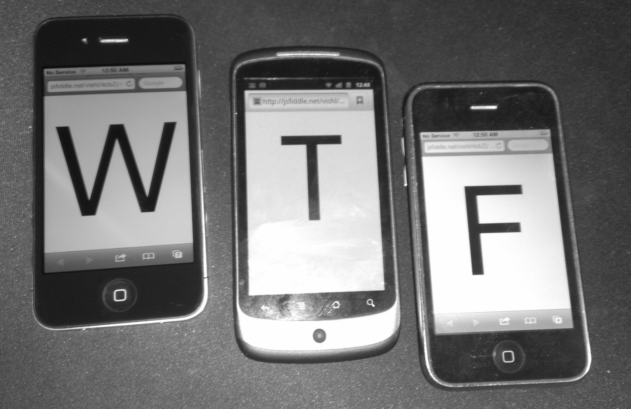 These are all quirks/bugs I found in about 2 weeks of mobile development. I am sure there are many more out there. This is very disappointing. I feel like I am back in 1999 where no browser is standards compliant for even the most basic things and my code is riddled with IF statements checking the user agent. Fundamental features like scrolling divs and fixed position elements seem to have poor support, while ironically, more modern features like animations and supported fairly well. There are many third party libraries that try to absorb these eccentricities such as jQuery Mobile, Sencha, and iScroll. These are all widely used, but the first two are fairly heavy-weight and impose many additional design decisions beyond abstracting layout differences. I’d love to hear about other peoples experiences with mobile web development and the solutions they have come up with.